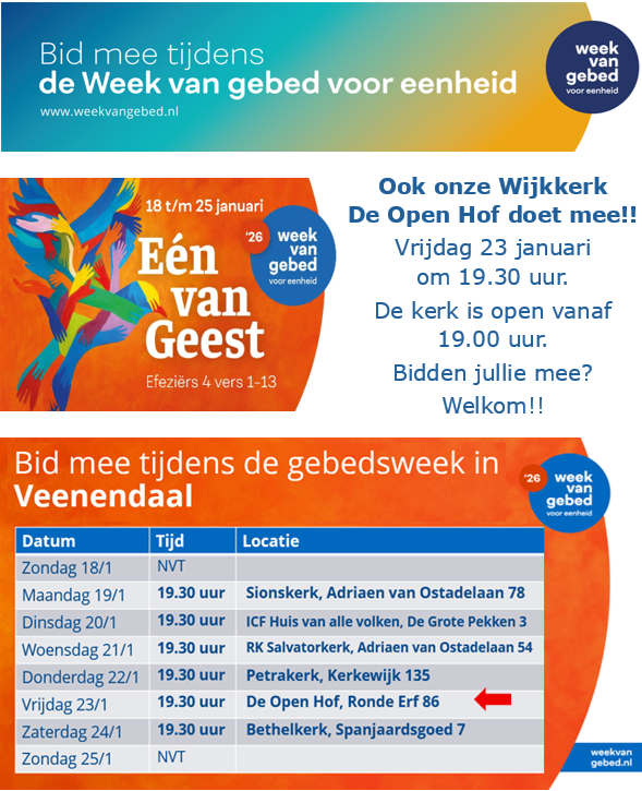 Zondag 11 januari is er weer ‘Samen zingen op zondagavond in De Open Hof'. Als altijd is er een gevarieerd programma van mooie liederen. Voorganger is deze keer ds. Coby de Haan. De zangavond begint om 19.30 uur en duurt ca. een uur. Na afloop is er gelegenheid voor ontmoeting bij een kop koffie of thee. Weet je van harte welkom!Wie via kerkdienstgemist deze avond meebeleeft kan hier het programmaboekje downloaden. |