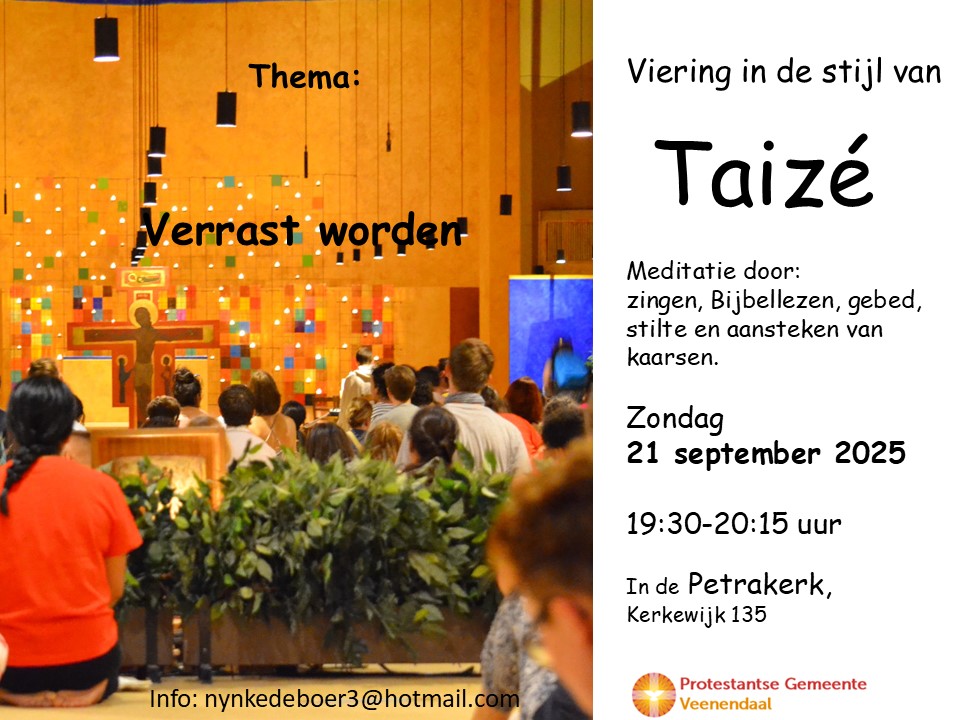 In onze gemeente worden sinds een aantal jaren Taizé-vieringen gehouden. Deze vieringen zijn er voor iedereen, jong maar ook ouder, die zich aangetrokken voelt tot stilte en meditatie volgens de gedachte van de kloostergemeenschap van Taizé. Vieringen van zingen, lezen, stilte, gebed, muziek en het aansteken van kaarsen.Contact: Nynke de Boer, nynkedeboer3@hotmail.com | ||